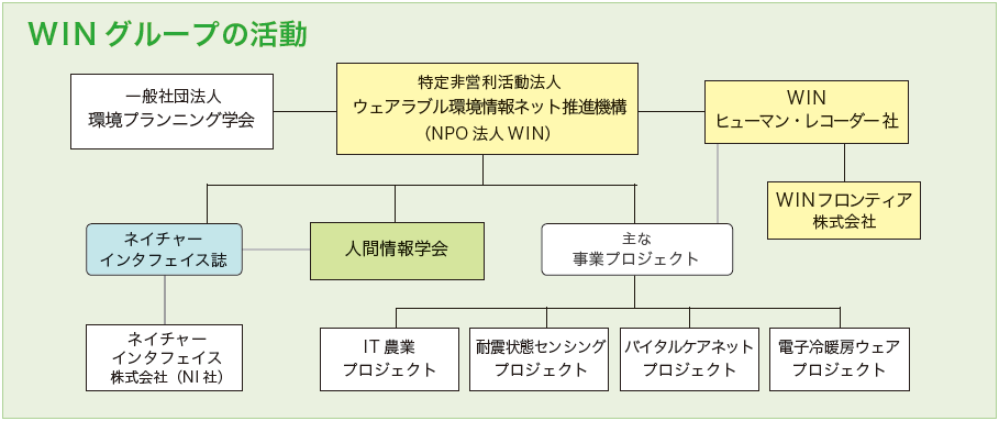 「WIN」とは、ウェアラブル・インフォメーション・ネットワークに関する技術、製品、事業、市場等の社会システムの現状及び将来像についの調査研究・普及推進等を行うことによって、新たなインフォメーション・ネットワークの学問体系及び事業/企業の創成を図ることを目的とした特定非営利活動法人「ウェアラブル環境情報ネット推進機構」です。(2000年8月発足)