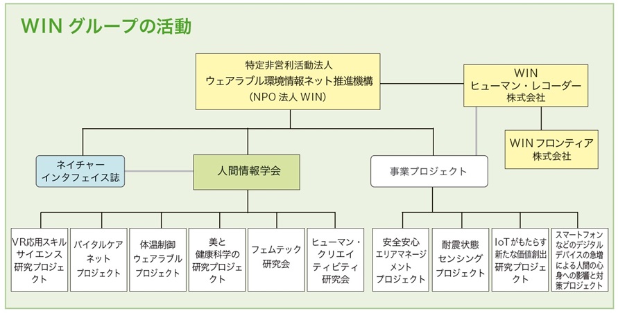 「WIN」とは、ウェアラブル・インフォメーション・ネットワークに関する技術、製品、事業、市場等の社会システムの現状及び将来像についの調査研究・普及推進等を行うことによって、新たなインフォメーション・ネットワークの学問体系及び事業/企業の創成を図ることを目的とした特定非営利活動法人「ウェアラブル環境情報ネット推進機構」です。(2000年8月発足)